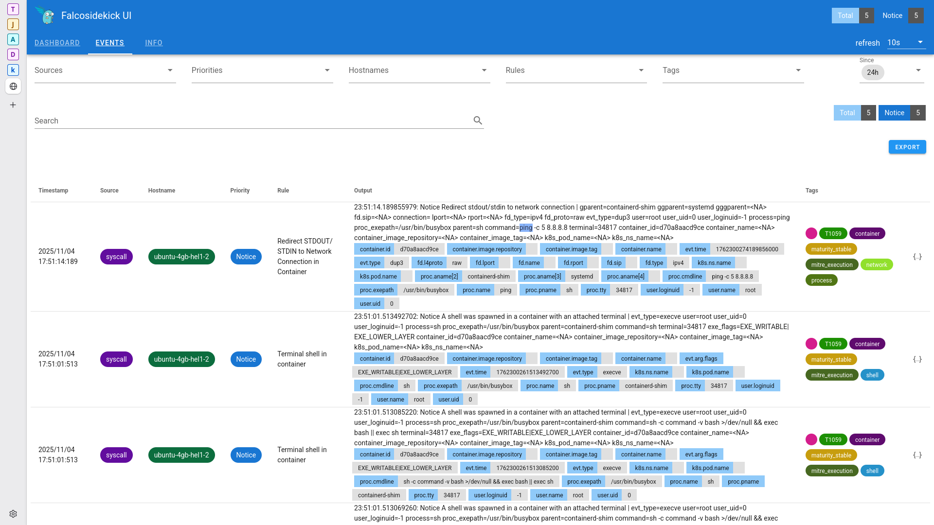 Deployed on Kubernetes using Helm charts with eBPF driver configuration for optimal performance. Features 10+ custom detection rules covering execution (T1609), resource hijacking (T1496), and container escapes (T1613) following MITRE ATT&CK Containers Matrix for comprehensive threat coverage.